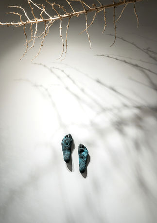 Reclamation exhibited EARTHflows from the FlowRate ritual performances and community events in 2023 and 2024. A tritypch of EARTHflows from EARTHflow, Rebirth at CSU Pueblo Gallery, FlowRate, Studio 121 at CSU Pueblo, produced Deep Sea Angler, as well as pieces from the Cracked Earth / Rising Blue Installation, where one ton of local clay/ mud was poured in BloBack Gallery, 2023. These fragments of cracked earth became Tectonic Plates, conversations as they were fired and moved to the wall. Tectonic plates, conversation 1 is currently on permanent display at BloBack Gallery. Bronze and stone figures move through this landscape of elements, and the projection creates an immersive aspect.